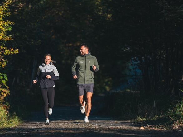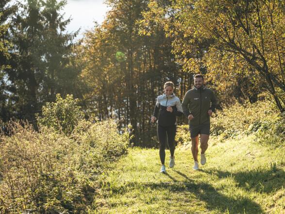 Vorwiegend läuft man auf Waldboden und Schotter, im Ortsbereich Asphalt.