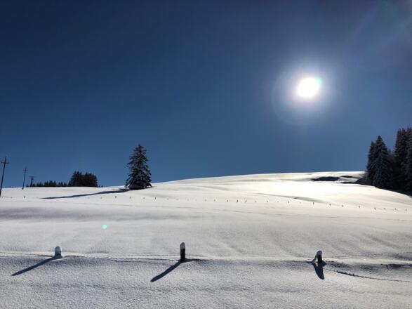 Herrliche Schneeschuh- und Bilgeriskitour über die sanften Hügel zum "Berghof Alpenblick" (wunderbare Einkehrmöglichkeit) in Stoffels. Alpenblick und atemberaubende Fernsicht inklusive!