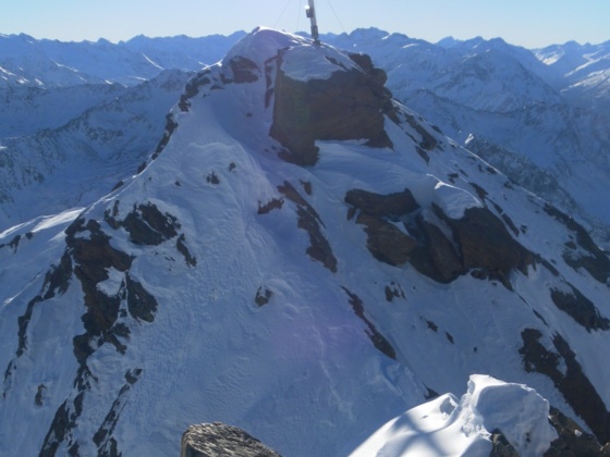 Der kurze Felsgrat kann beim Abstieg in der steilen Ostflanke umgangen werden. Abfahrt über den Gaiskarferner mit Gegenanstieg zum Bildstöckljoch. Zusätzlich kann ohne viel Umweg beim Eisjoch ein Besuch der interessanten Bergkapelle und/oder die Besteigung des Top of Tyrol angeschlossen werden. Danach Abfahrt über den Stubaier Gletscher.
