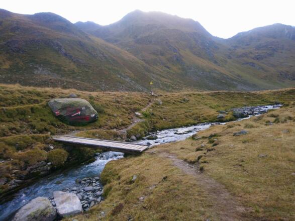 Von der Hütte den gekennzeichneten Weg Richtung Süden. Zunächste durch Hochalmen und Wiesen nbis zu den Blockfelder von den Seen. Schöner Blick auf die Berggipfel im Kranz der 3000er vom Gleirschtal.Am Wegweiser nach den Seen führt eine mit Steinmänner gekennzeichnet Wegspur oder Weglos ins hintere Gelirschtal. Zurück am Wegweiser "Seenrundeweg" steigen wir hinunter zum Gleirschbach. Der Gleirsch- und Zischgenferner liefern vor allem am Beginn des Sommer eindrucksvolle Wassermassen. Am Talgrund angekommen, folgen die dem Bach abwärts und der Wasserfall lädt zum Rasten ein. Bis zur Brücke an der offengelassenen Hinteren Gleirschalm geht es an schönen feldern mit Alpenrosen und Blumenwiesen. Der Aufstieg zur Hütte ist es schöner Bergpfad mit vielen Bachquerungen.