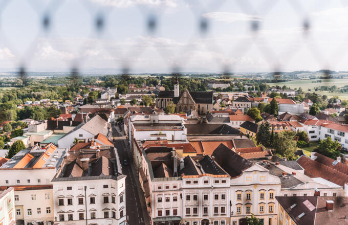 Inmitten des in sich geschlossenen Hauptplatzes ragt das weithin sichtbare Wahrzeichen der Stadt in den Himmel. Der fast 60 Meter hohe, freistehende Stadtturm wurde zwischen 1564 und 1568 unter Kaiser Maximilian II. als Glocken-, Wach- und Uhrturm erbaut.