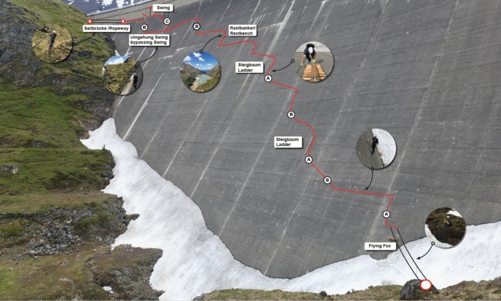 Der Klettersteig auf der Staumauer hat den Schwierigkeitsgrad A-B mit einer C-Variante (Swing).