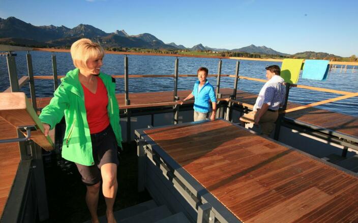 Vom Füssener Zug- und Busbahnhof bringt Sie die Buslinie 56 nach Hopfen am See zur Haltestelle "Hopfen, Uferstr./Bergstr.".