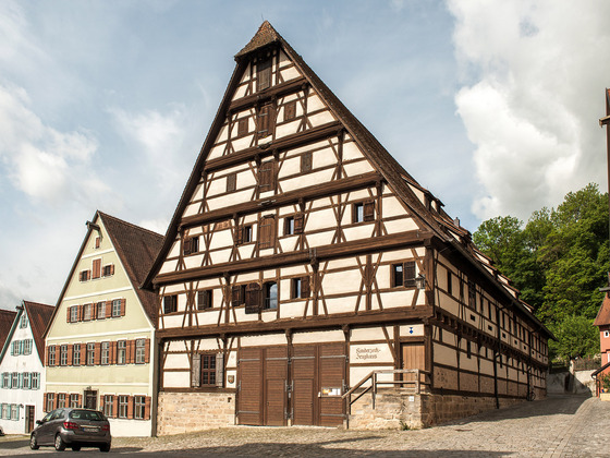 Dinkelsbühl: 1188 wurde burgus Tinkelsbihel im Ehevertrag zw. Konrad v. Rothenburg, Sohn Barbarossas, und der kastilischen Königstochter Berengaria erstmals urkundlich erwähnt. Der Kern um St. Georg mit dem Turmuntergeschoss von etwa 1220 ist eine der beachtlichsten Stadtsiedlungen Frankens. Der Ort lag in zentraler Lage an einer Pilgerstraße nach Rom. Die Straße ist von Norddeutschland über Würzburg, Rothenburg und dann weiter nach Augsburg bereits 1236 belegt und verband die Regionen des Heiligen Römischen Reichs Deutscher Nation mit allen Teilen Europas. 1309 gelang es der Stadt, sich von fremdem Gerichtszwang zu befreien und ihre Autonomie auszubauen. Der erste Mauerring war Ende des 13. Jahrhunderts fertig gestellt und die wichtige Herbergspflicht nachgewiesen. 1282 ist in Gebsattel bei Rothenburg ein Ablassbrief ausgestellt, der das Bestehen des Dinkelsbühler Heilig-Geist-Spitales beweist, das den ersten Krankensaal in Betrieb genommen hatte.