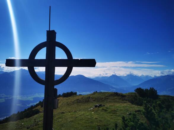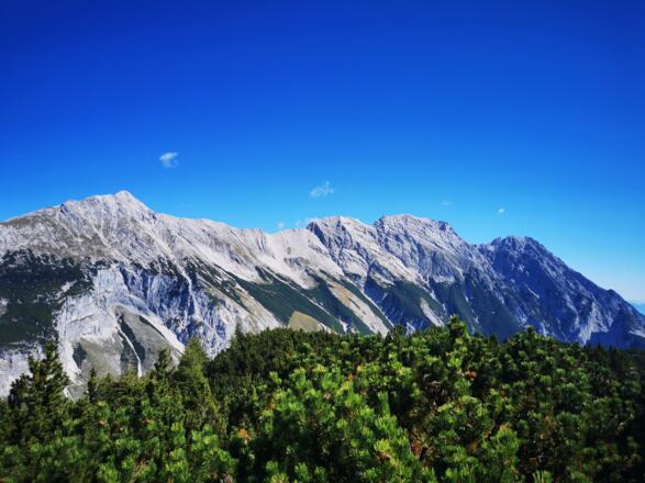 Die Sicht ist gewaltig, trotz der vielen, höheren Berge im Rücken. Bettelwurf, Lafatscherjoch, Wildangerspitze, Lattenspitze, Wilde Bande Steig...um nur einige zu nennen. Zur anderen Seite schweift der Blick in das Inntal hinunter bis zum Stubaier Gletscher und den Zillertaler Alpen. Ein wahrlicher Aussichtsberg.