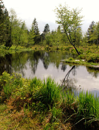 Ein schöner Platz zum Rasten und Schauen ist der große Moorweiher, in dessen dunklem Wasser sich Moorbirken und Latschen spiegeln. Der aufgelassene Torfstich ist Beleg dafür, dass hier Jahrhunderte lang Torf gestochen wurde. In früheren Zeiten nutzten die Bauern den getrockneten Torf, dessen Brennwert zwischen dem von Holz und Braunkohle liegt, als Heizmaterial.