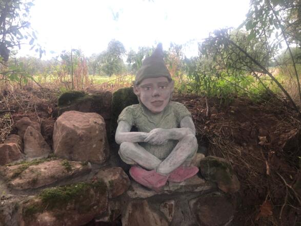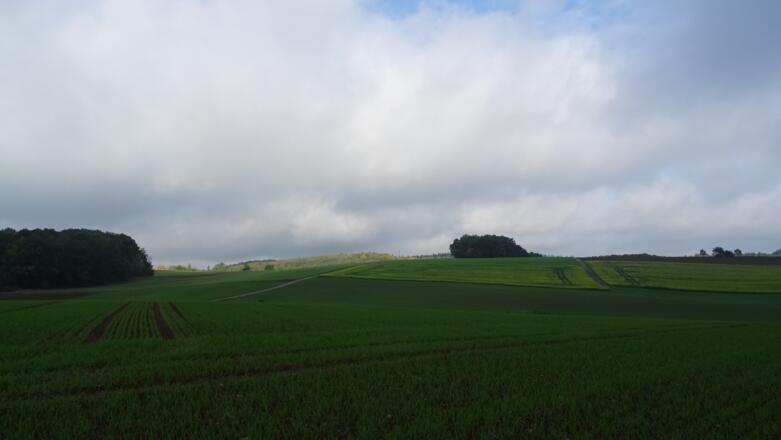 Wir verlassen die Ortschaft und uns erwartet eine Landschaft mit satten grünen Wiesen, Apfelbäumen und Feldern. An der Kreuzung, an der es in den Wald hineingeht, biegen wir nach rechts ab und laufen am Waldrand entlang.