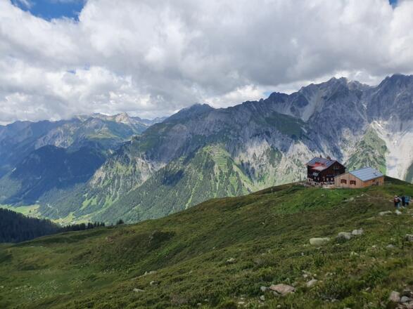 Am westlichen Maroikopf (2.522m) vorbei führt uns der Weg zum Alpkopf. Von kleinen Felsstufen durchsetzt schlängelt sich der Weg hier hinab zur schön gelegenen Kaltenberghütte (2.100m) der DAV Sektion Reutlingen. Knapp über der Hütte stoßen wir wieder auf den Berggeistweg. Jetzt können wir einkehren und noch einmal die Aussicht genießen.