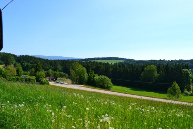 Weiter geht es! Nach dem Berggasthof Oberfrauenwald rechts ab- biegen. Sie haben eine schöne Abfahrt von ca. 7 km mit Blick zum Erlauzwiesler See.