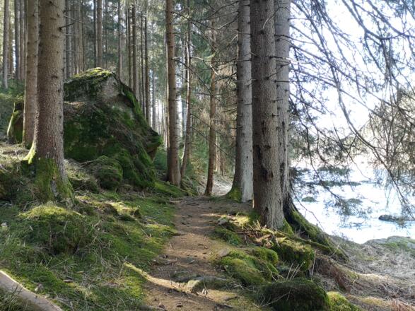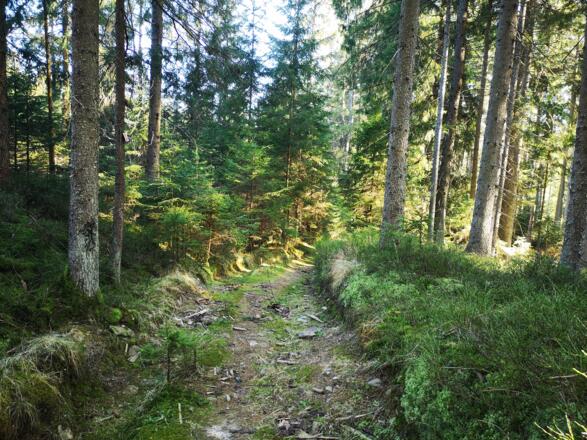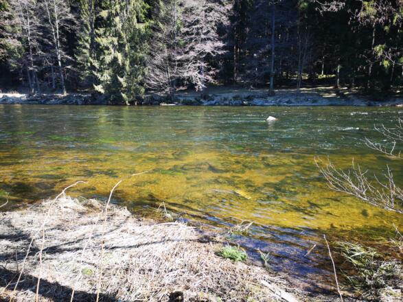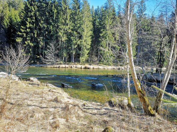 Die Forststraße weicht hier, immer noch der Nummer 14 folgend, einem ursprünglichen Pfad der über Stock und Stein an der Flusslandschaft entlangführt. Zur linken Seite erstreckt sich bemooster, verwunschener Wald. Zur rechten Seite windet sich urtümlich der Fluss, das Dunkel des Wassers teilweise unterbrochen vom schimmernden grün der Unterwasserpflanzen.