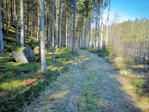 Wir setzen unsere Wanderung fort, der Nummer 14 folgend. Diese führt zuerst hoch über dem schwarzen Regen und lässt ab und zu einen Blick auf den Fluss erhaschen. Der Forststraße weiter folgend begeben wir uns tiefer hinab ins Flusstal. Ziel der Wanderung ist bayerisch Kanada. Durch seine sanften Flusslandschaften, dem wildromantischen Flusslauf und der unberührten Natur wird das Tal des Schwarzen Regens liebevoll „Bayerisch Kanada“ genannt.