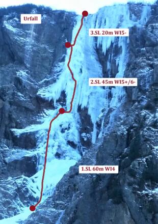 Man steigt im linken Wandteil in den Eisfall ein und folgt flacheren und steileren Bereichen bis in eine Verflachung, bevor sich der Eisfall aufsteilt. Hier Eisstand an Eisschrauben machen. Die zweite Seillänge ist deutlich steiler und schwieriger und zieht nach einem kurzen Quergang senkrecht nach oben. In einer kleinen Nische kann der nächste Eisstand errichtet werden. Die letzte, steile, kürzere Seillänge führt zum Ausstieg und zum Ende der Tour. Hier im letzten noch guten Eis Stand an Eisschrauben und eine Sanduhr zum Abseilen machen. Durch zweimaliges Abseilen zuück an den Fuß des Eisfalles.
