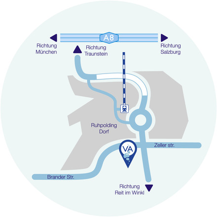 Über die Autobahn A8 - München - Salzburg - ist Ruhpolding sehr gut zu erreichen. Ab Ausfahrt Siegsdorf sind es nur noch 8 km bis zu uns.