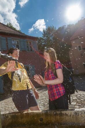 Vom Bahnhof in Roth aus führt uns der Wanderweg „Burgen und Schlösser“ zunächst durch die Rother Innenstadt, vorbei am ersten Highlight der Tour, dem Schloss Ratibor, bis zur Oberen Mühle, die das Fabrikmuseum Roth beherbergt.