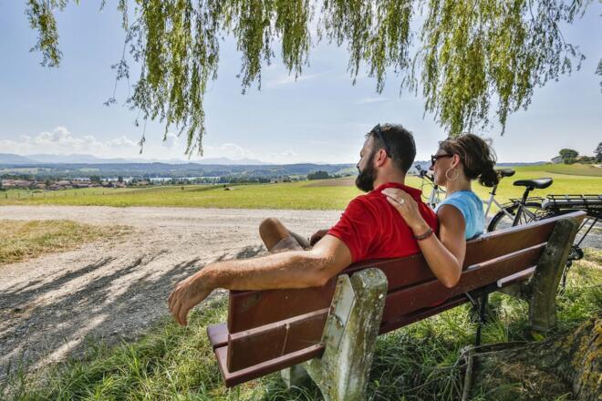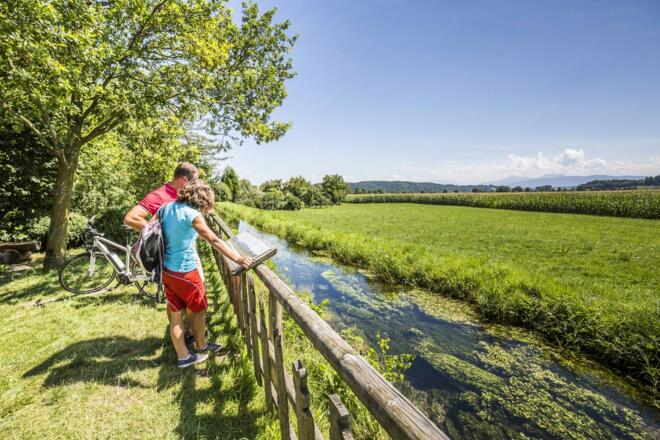 Auch in Bicheln tut sich ein atemberaubender Blick auf den Waginger See auf. Von dort aus geht es nach Tettenhausen (bekannt als Filmkulisse bei „Dahoam is Dahoam“). Vorbei an lauschigen Strandbädern, Campingplätzen und einer Bergpanorama-Tafel, die das Voralpenland erklärt, verläuft die Tour weiter nach Petting. Hier lohnt sich ein Abstecher ins Schönramer Filz – ein Naturkleinod aus der letzten Eiszeit. Der Rückweg führt entlang am Westufer des Waginger Sees und endet wieder in Waging. Empfehlenswert ist ein Abstecher zu der hoch oben thronenden Kirche Maria Mühlberg, einer bekannten Wallfahrtskirche mit herrlichem Blick auf beide Seen.