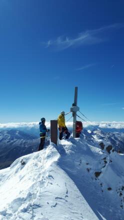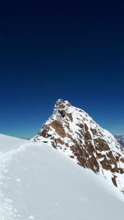 Den schwierigsten Teil stellt der Gipfelgrat dar, der je nach Schneeauflage in seinem Anspruch variiert. Hier müssen umbedingt noch Kraftreserven vorhanden sein, sonst wird es kritisch. Am besten dort angeseilt gehen, es lässt sich recht gut über Zacken und Köpfl sichern.