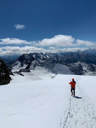 Am Steinschlagjoch wird angeseilt und es geht entspannt und spaltenarm zum Matscher Wandl.