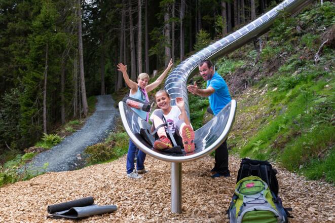 Familien, die „wild“ sind auf neue Bergerlebnisse, lassen sich in der Wildkogel-Arena Neukirchen & Bramberg von der Wildkogelbahn in Neukirchen auf 2.100 Meter Höhe „heben“. Wenn die großen und kleinen Naturentdecker in der Abenteuer-Arena Kogel-Mogel, dem riesigen Holzspielplatz direkt neben Bergstation, vom Adlerhorst und der Kugelbahn bis zur Goliath-Schaukel alles ausprobiert haben, geht es weiter zum nächsten Abenteuer. Der neue Panoramaweg führt sie von der Bergstation (2.091 m) bis zur Mittelstation (1.644 m) – traumhafte Ausblicke auf die Dreitausender des Nationalparks Hohe Tauern und den Großvenediger (3.666 m) inklusive. An der Mittelstation der Wildkogelbahn erhält man dann die „Lizenz zum Rutschen“: Der neue Rutschenweg mit zehn Edelstahlrutschen zwischen 22 und 53 Metern Länge lässt nicht nur Kinderherzen höherschlagen. Es geht durch Röhren, über Mulden und Wellen – und die Rutsche mit Freifall-Effekt entlockt Groß und Klein so manchen Freudenschrei. Vom Endpunkt beim Gasthof Stockenbaum gelangt man in rund 50 Minuten über einen gemütlichen Wanderweg bis ins Tal nach Neukirchen.