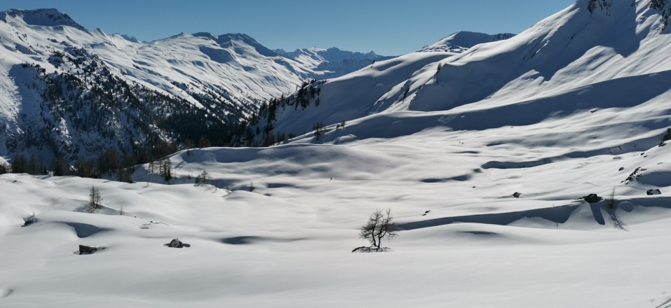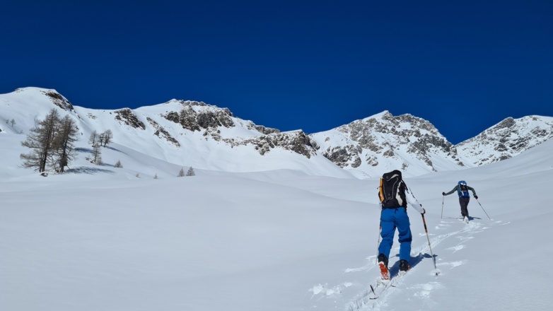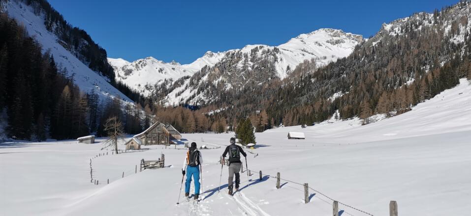 Die gegenständliche Route hat einen vergleichsweise langen Talzustieg (1h 15min). Ein Teil davon (ca. 2,5 km) muss auch bei der Abfahrt mit kräftigem Schieben oder mit Skating Technik bewältigt werden. Von Einsamkeit und von unverspurten Hängen kann man daher auf dieser Unternehmung ausgehen.
