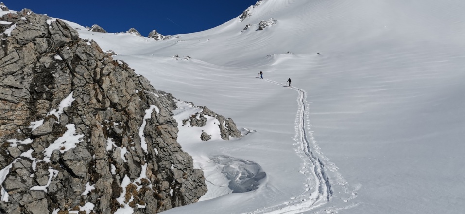 Die Spurwahl oberhalb der Windischscharte ist der lokalen Schneedeckenbeschaffenheit anzupassen (Hangrichtung N-NW, Hangneigung ~35°)