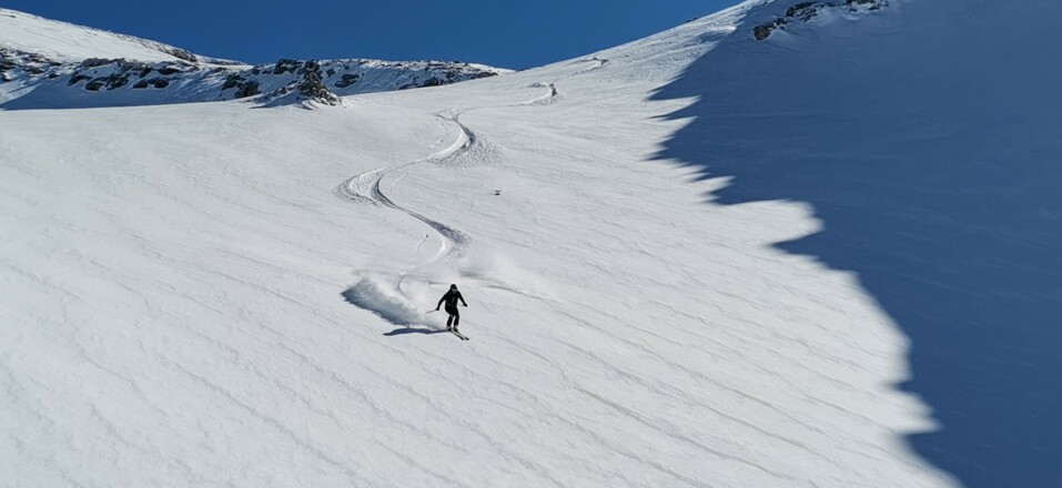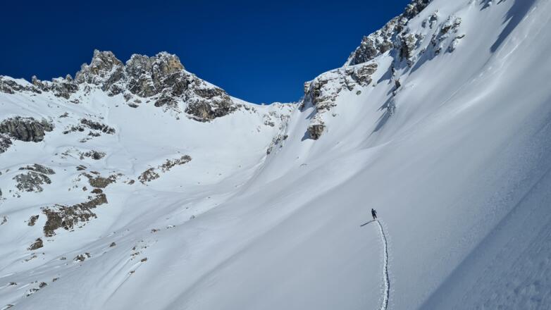 Die Abfahrt folgt im wesentlichen der Aufstiegsspur, wobei die die Hangrichtung und die Sonneneinstrahlung die Ideallinie mit den besten Schneeverhältnissen bestimmen.