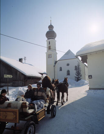 Sie wandern in Richtung Waldfriedhof Wängle, weiter auf dem verschneiten Wiesenweg in Richtung Pfarrkirche (sehr sehenswert!) und wandern dann über den PanoramaHöhenweg nach Holz