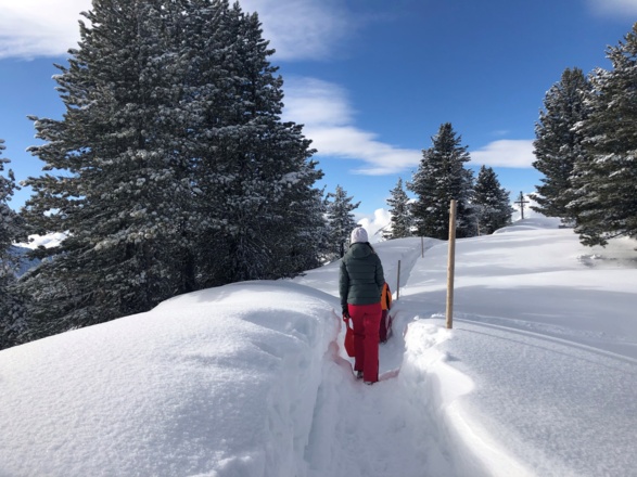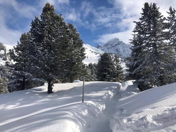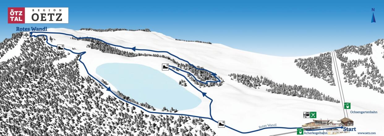 VVorbei am Speichersee und dem WIDIVERSUM geht es zum Aussichtspunkt "Rotes Wandl". Von dort eröffnet sich ein wunderschöner Blick über das vordere Ötztal und das Inntal. Der Winterwanderweg wird gespurt und verläuft abseits der Skipisten. Der letzte Anstieg zurück zum Speichersee ist etwas steiler.