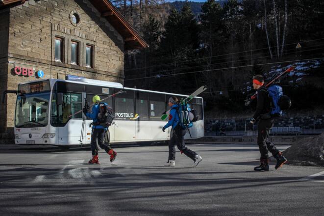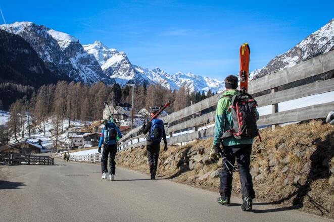 Mit den Skiern am Rücken spazieren wir zur S-Bahn-Station in Gries und fahren zurück zu unserem Hotel in Matrei.