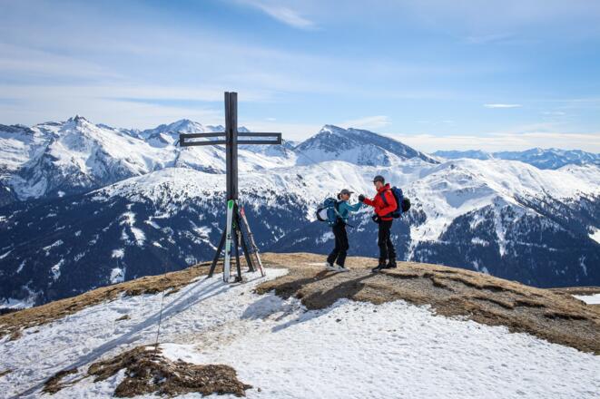 Durch wellige Geländestufen, lichten Wald und über Wiesen wedeln wir hinunter nach Gries am Brenner. Direkt unterhalb der Autobahnbrücke schnallen wir die Skier ab. Ein weiterer Gipfel ist überschritten und wieder haben wir eine einsame Ecke des Wipptals erkundet.
