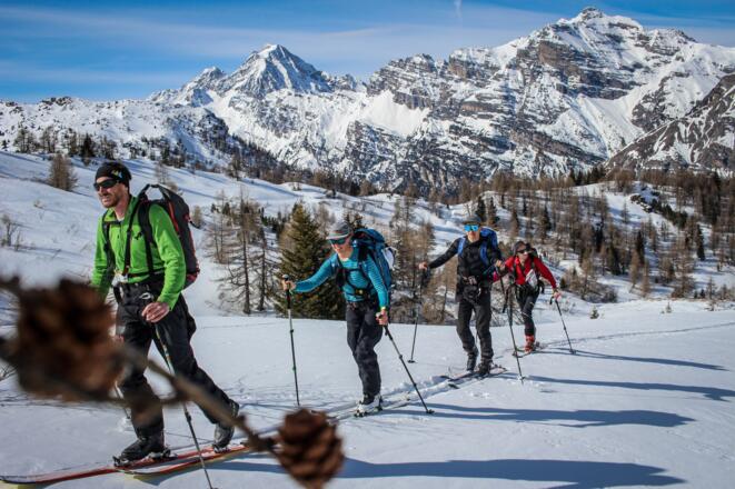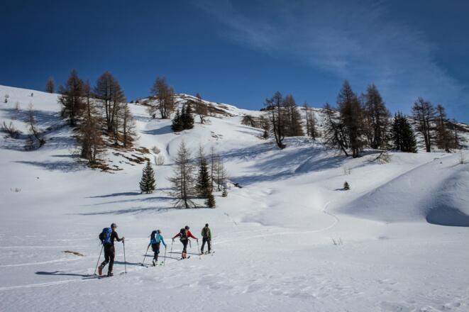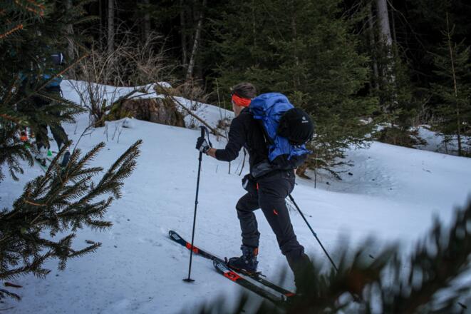 An der Skipiste schnallen wir die Skier an, verlassen diese aber bald rechtshaltend und tauchen in die Stille des Waldes ein. Entlang des Forstwegs steigen wir Richtung Trunahütte auf. Etwas mühsam kürzen wir den Forstweg durch den Wald ab. Wer es gemütlicher haben will, nimmt einen kurzen Umweg in Kauf und folgt der Forststraße bis zur Trunahütte.
