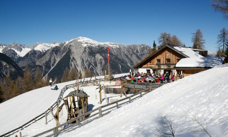 Von Zams wandert man über blühende Wiesen, durch den Wald und teilweise an der Skipiste entlang zur Zammer Alm.