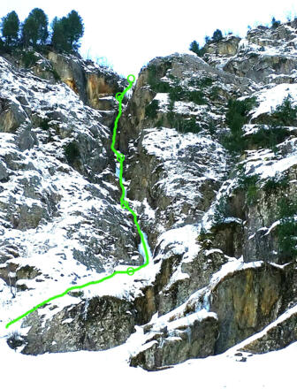 Mit Dominik probierte ich heute den schmalen Gully links vom Ersten Zwerg. Nach 2 leichten Längen kam mit der dritten auch die Schlüssellänge, ein Kaminsystem mit dünnen Eisglasuren und guten Rissen zum Legen von Friends und Co. 2 Felshaken wurden geschlagen und belassen. Die letzte Länge führte über ein Abschlussdachl aus dem Gullysystem hinaus zum Eis des Ersten Zwerges, über den wir in drei Seillängen abseilten.