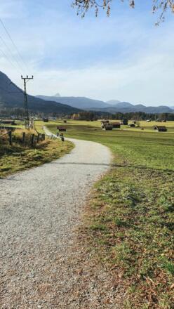 Deine Tour beginnt am Parkplatz der Alpspitzbahn, du läufst auf dem Fußweg zwischen den Wiesen in Richtung Hammersbach. Dieses Stück kannst du nutzen, um dich warm zu laufen und deinen Rhythmus zu finden. Genieße den Blick über die weiten Felder und auf das Kramer Massiv. Den ersten Kilometer läufst du in der Ebene und größtenteils auf Asphalt, bevor es hinauf in Richtung Jägersteig und Kreuzeckhaus geht.