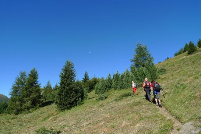 Nach dem erstein Teil des Anstiegs durch den Wald erreicht man am Ende der Forststrasse eine große Fläche, ein Überbleibsel aus der Bauzeit der großen Lawinenverbauung, die rechts oberhalb zu erkennen ist.