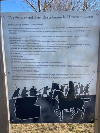 Nach einer ausgiebigen Pause an der bewirtschafteten Hütte gehen wir auf gleichem Weg bis zur Autobahnbrücke zurück. Gleich nach der Brücke geht der Weg rechts weg, Ein kurzes Stück leider neben der Autobahn auf breit geschottertem Weg. Wir folgen nun immer dem roten Querstrich auf weißem Grund. Der Weg führt uns teils auf breitem Schotter mit super Aussicht auf Coburg mit der Veste, aber auch teils auf engen Waldwegen. Am " Donnerloch" vorbei geht es wieder in den Wald. Der breite Waldweg führt uns am Waldkindergarten vorbei bis zum Startpunkt in Oberlauter immer der Markierung roter Querstrich entlang.